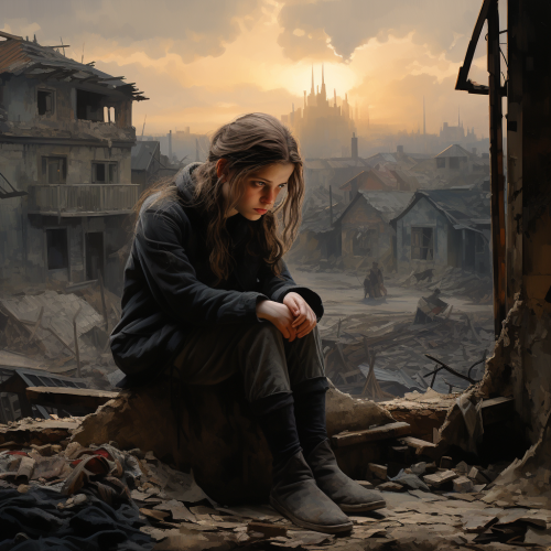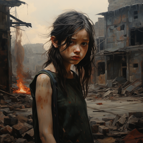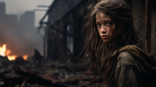 imagine a girl crying out loud in aftermath of war, broken buildings in the back, long shot, hyper realistic, --ar 16:9