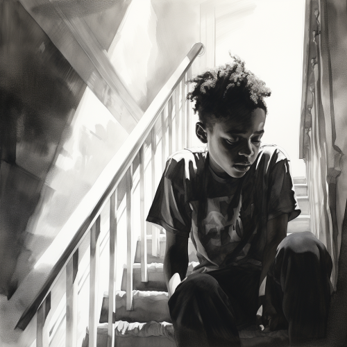 blk and white watercolor of 6 year old Black boy crying under a stairwell, realistic, with sunlight shining down on him through a window