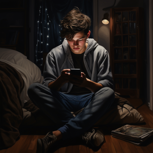 front view en su casa, adolescente hombre llora frente a la pantalla de su celular vuelve a brillar muy fuerte y el smartphone bota imagenes en todo el cuarto.