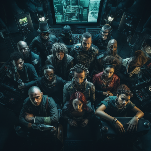 16:9 overhead shot of dark weird industrial cyberpunk band of creature hybrids. Stylish like a futuristic prodigy or trainspotting gang. A crowd of cool cyberpunk hipsters are going wild. Cinematic fashion photography