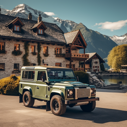 Land Rover Defender (Heritage Edition) in front of a montain lodge villa