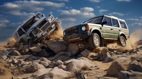 a 2004 land rover discovery 2 beating up a jeep rubicon, amazing detail, hyperrealistic, 8k --ar 16:9