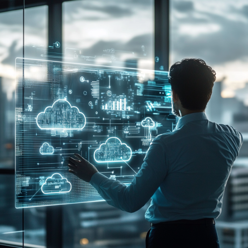 An executive office with a modern digital interface, showing a consultant reviewing complex cloud architecture on a transparent holographic screen. The consultant, standing confidently, points at cloud diagrams and SAP system charts. In the background, a futuristic cityscape with clouds and data streams in the sky, symbolizing the digital transformation. The atmosphere is professional and high-tech, with soft blue and silver tones, representing clarity and precision. The image conveys trust, expertise, and a sense of problem-solving in cloud migration. 4K --v 6.1