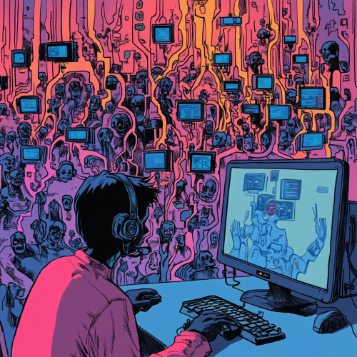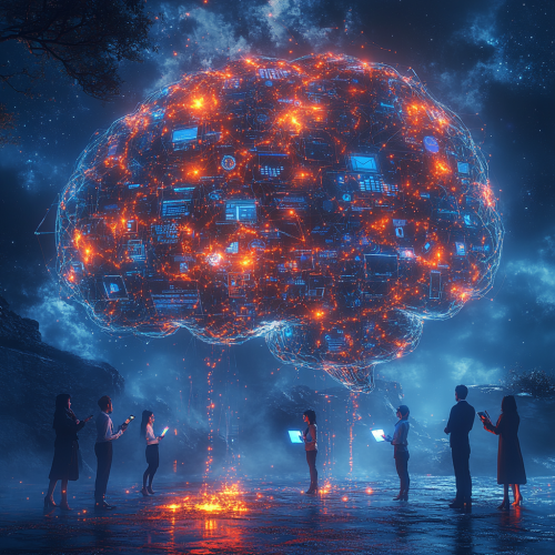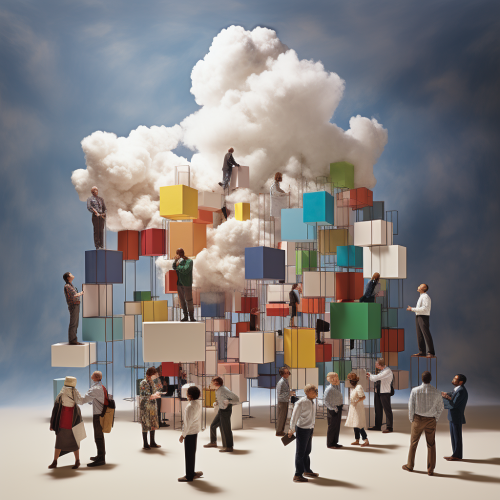 a group of people with their heads stuck in "metaphorical" clouds, the cloud itself is composed of blocks representing data in a cloud computing-architecture, the clouds should be connectet through data-streams, lifelike, artistical, colorful, vivid