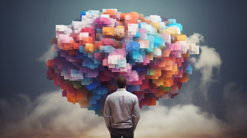 a human with his head in a "metaphorical" cloud, the cloud itself is composed of blocks representing data as a cloud computing-architecture, artistical, colorful, vivid --ar 16:9
