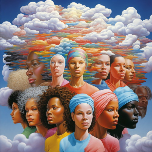 different people of different ethnicities with their heads in "metaphorical" clouds, the cloud itself is composed of blocks representing data as a cloud computing-architecture, the clouds should be connectet through data-streams, artistical, colorful, vivid