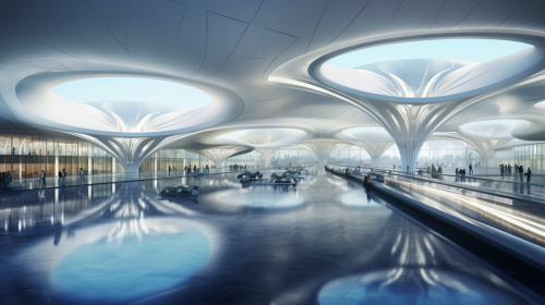 a future-forward transportation terminal where travelers are boarding high-speed trains and aircraft, their paths crisscrossed with flowing data streams and digital interfaces. The terminal itself should boast neo-classical design elements, with a color palette primarily in blue and cream --ar 16:9