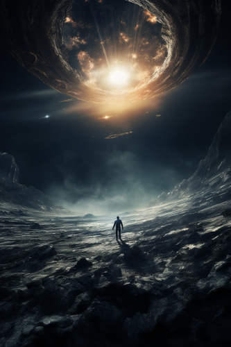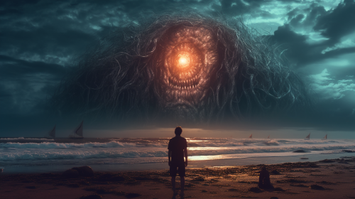 man on the beach, watching huge lovecraftian cosmic horror in the sky, night, full moon, 8k, sharpened image, realistic, Hyperrealistic, very detailed, --style raw --ar 16:9 --v 5.2