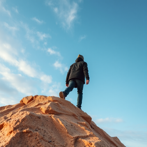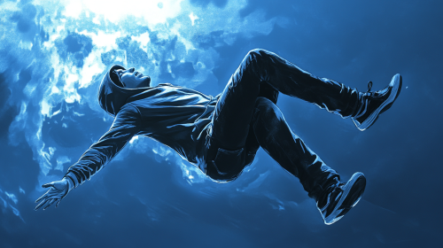 a man in hoodie and black jeans floating in the sky on his back with spread arms an legs in a relax position leaning back.like his falling from the sky. Mystical bright light from the background. Side view. Sketch style in only blue and black. --s 75 --ar 16:9