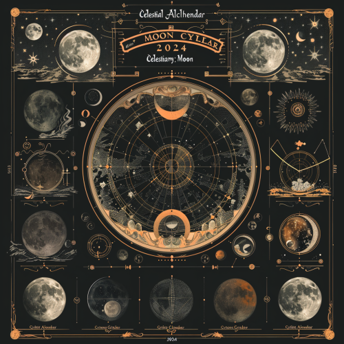 Title: "Celestial Alchemy: Moon Cycle Calendar 2024" Description: Create a visually captivating moon cycle calendar for 2024, inspired by alchemy and celestial phenomena. Design twelve illustrations, each representing a month, incorporating intricate alchemical symbols, celestial motifs, and accurate lunar phases. Highlight the interplay of light and shadow to symbolize the eternal cosmic dance. Ensure rich detail and symbolism invite viewers to explore the mysteries of the cosmos. Prominently display the title "Celestial Alchemy: Moon Cycle Calendar 2024" in elegant script atop the calendar. 9:16