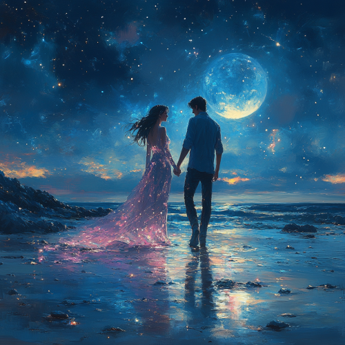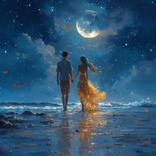 imagine a man and a woman holding hands in a long holographic and transulent black and white gown walking on a beach infront of a blue moon and cosmic starry sky, in the style of nightcore, sailor moon manga style, i can't believe how beautiful this is, dark white and light blue, dreamlike naturaleza, dreamlike figures, butterflies, butterfliecore, soft-edged, holographic, glowing --s 750