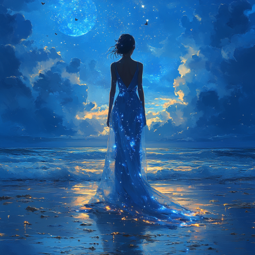 imagine a woman in a long holographic and transulent navy gown walking on a beach infront of a blue moon and cosmic starry sky, in the style of nightcore, sailor moon manga style, i can't believe how beautiful this is, dark white and light blue, dreamlike naturaleza, dreamlike figures, butterflies, butterfliecore, soft-edged, holographic, glowing --s 750