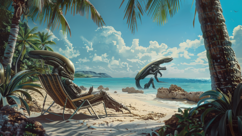 In the style of John William Waterhouse Galaxina sitting on a beach chair next to a xenomorph on a tropical beach in Aruba, resort photo background landscape breathtakingly realistic illustration full body --ar 16:9