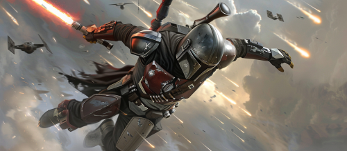 a photorealistic image featuring a mandalorian in full armor that is painted black, silver and red, flying above an outer rim spaceport, in the style of Star Wars --ar 16:7