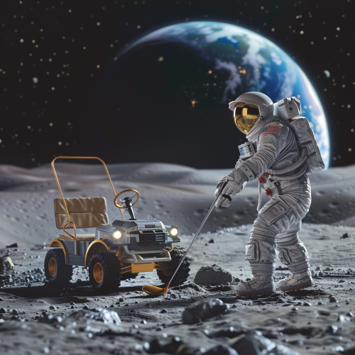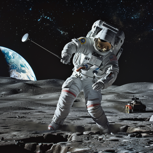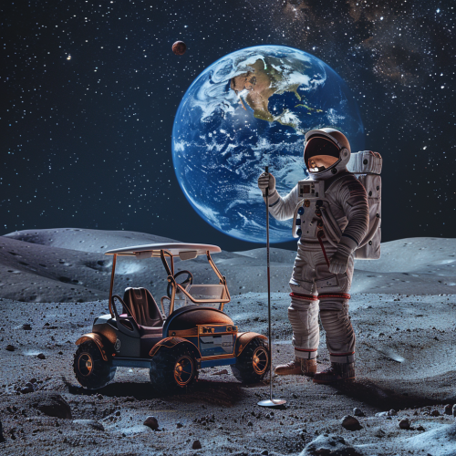Create a striking ultra-high-definition image showcasing an American astronaut in a full, detailed space suit, taking a swing with a golf club on the Moon's surface. The astronaut is captured in a dynamic pose, mid-swing, with the Earth majestically visible in the cosmic backdrop. In the background, subtly positioned, is a lunar rover, cleverly equipped with golf clubs, emphasizing the blend of exploration and leisure. This scenario should reflect the immersive depth and clarity akin to a photograph taken with a Sony A7III camera, utilizing a 55 mm f/1.8 Zeiss lens, under natural moonlight. Aim for a raw, unfiltered aesthetic, characteristic of high-quality photography, with a composition in a 16:9 aspect ratio to capture the vastness of the lunar landscape. The image should embody the advanced detailing and lifelike textures of version 6.0, ensuring an unparalleled visual experience. UHD, best quality, shot on camera Sony A7III, lens 55 mm f 1.8 Zeiss, natural lighting scenario--style UHD, best quality, shot on camera Sony A7III, lens 55 mm f 1.8 Zeiss, natural lighting scenario--style raw--v 6.0 --v 6.0 --ar 16:9
