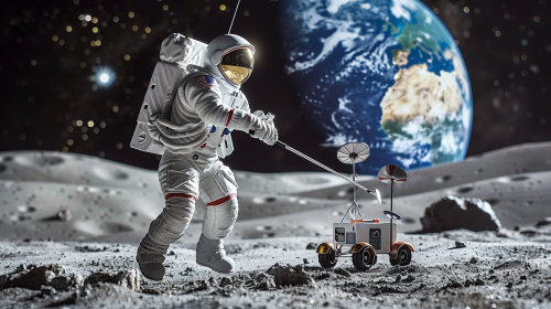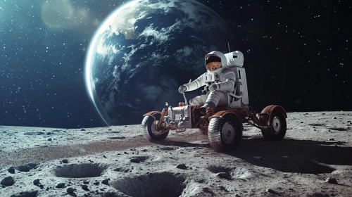 an astronaut driving a lunar rover vehicle on the moon surface in the space. earth planet seen in the background. futuristic autopilot robot technology. --v 6.0 --ar 16:9