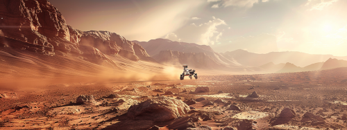 photorealistic view of mars landscape with rover in the background --ar 8:3