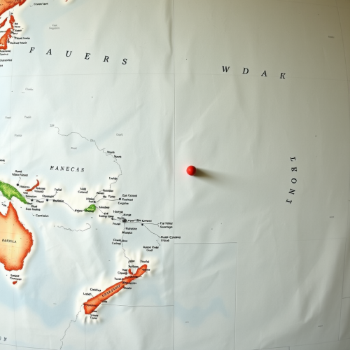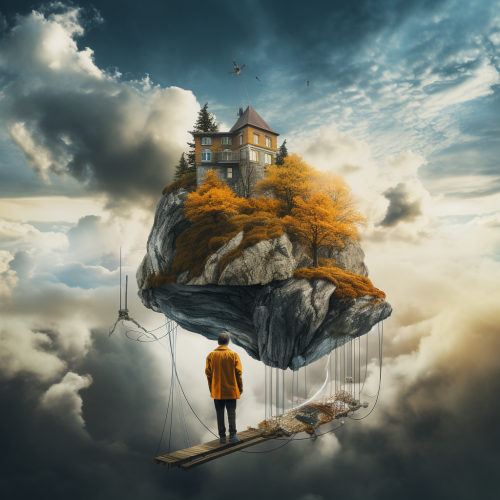 n the foreground on the mountain stands a man in a raincoat and looks up at a small island floating in the sky with wires and tree roots hanging down, on the island stands an unusual fantastic house made of amber, overcast clouds swirl in a funnel, Graphic Design, Double exposure Wallpaper, Side profile , orange, light grey and blue colors --s 50 --v 5.2