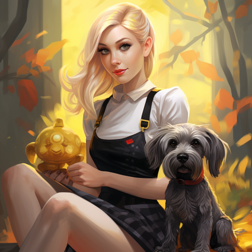 blonde woman, mini schnauzer, pokemon, creature, fanatasy world,