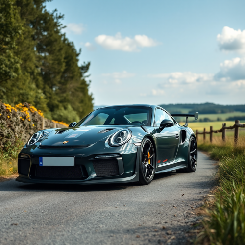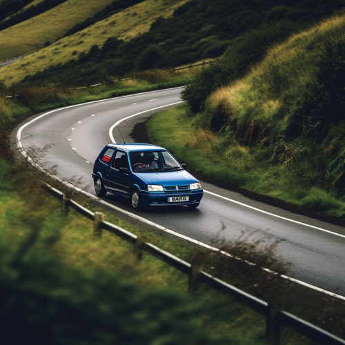 a classic blue Peugeot 106 drifting down a winding road. The road has a hill on one side and a cliff on the other side. Photograph for a car magazine.