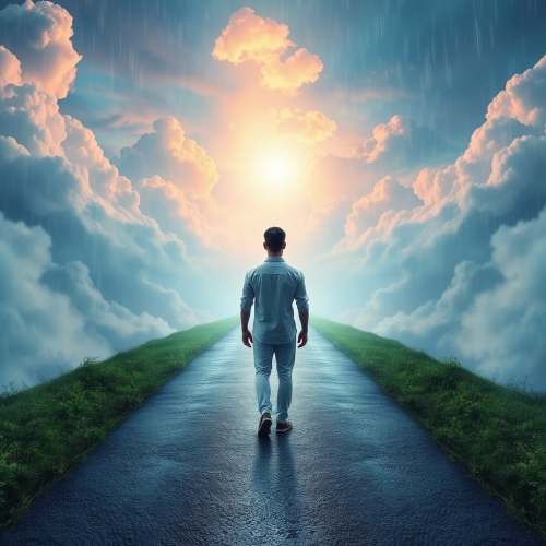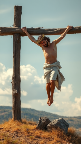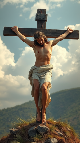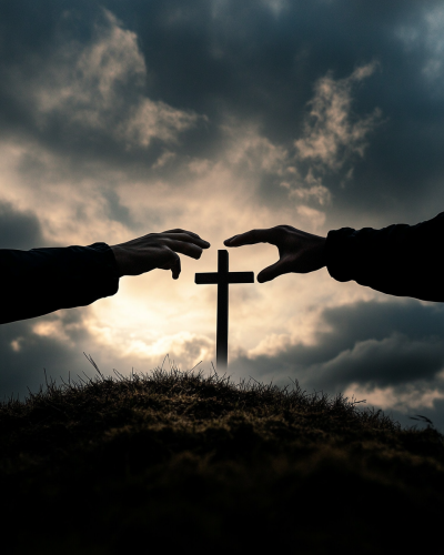 Two hands reaching towards each other, one hand holding a cross symbolizing Jesus Christ; the silhouette of a rolling hill with small patches of grass and more black space around the scene; a cloudy sky with soft sunlight filtering through; a realistic photography style with a focus on natural lighting and detailed textures. --ar 4:5
