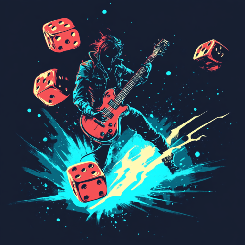 logo, two dices rolling in the air, Rock and roll style, Rockstar holding an electric guiter, minimalistic lightning background, electric elements --v 6.1