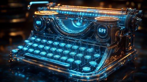 Digital old typewriter from 1900s in modern world, new form of writing in old style, old objects in new digitalized world, 3D form of self writing typewriter in blue color scheme with glowing glow and button structure, GPT chat controlling writing, on world scale --ar 16:9 --style raw --v 6.1 --stylize 1000