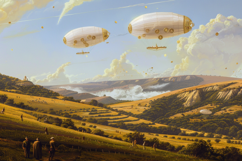airships dropping crypto tokens into a rolling hillside with people on the ground --ar 3:2
