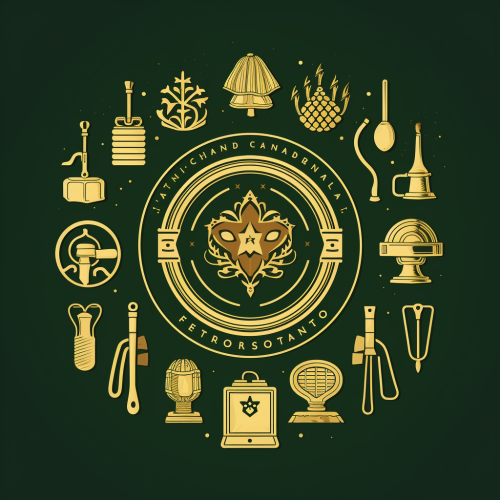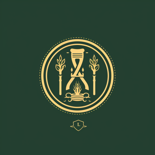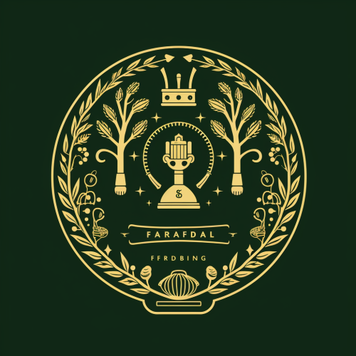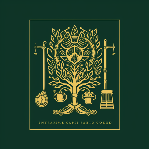 clean minimalist logo. gold foilstamp on green. fire brigade coat of arms. fire ladder, axe, firepole, fire. chef toque, rolling pin, spoon. sparkling orchard magic shield shape. circle. pagan. symmetry.