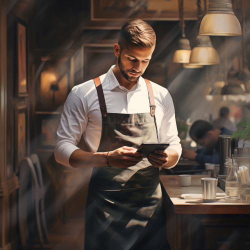 a realistic photo of a waiter, wearing apron, naturally looking at his smartphone, coffee house background