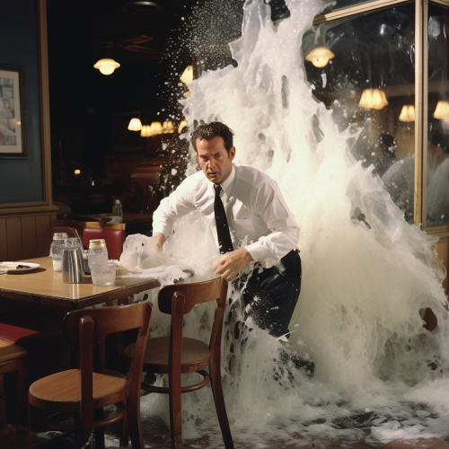 a jeff wall photograph of a middle aged man in an italian restaurant, he is sitting by a table turned to the camera, as he is served milk by a waiter, but the glass explodes and there is milk everywhere. Filmic, wide shot. Light from a window. Hyperrealistic