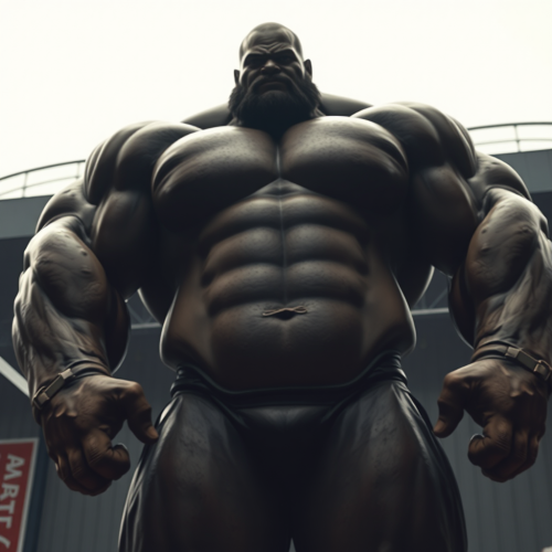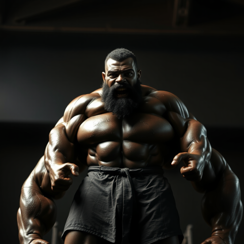 a 40 years old French bodybuilder with glasses and short white beard with a 30 years old huge Nigerian bodybuilder