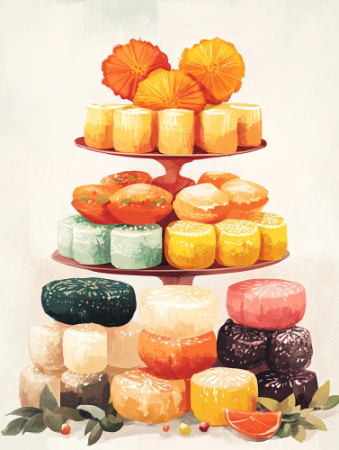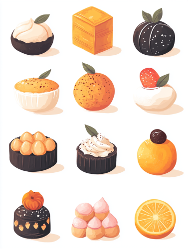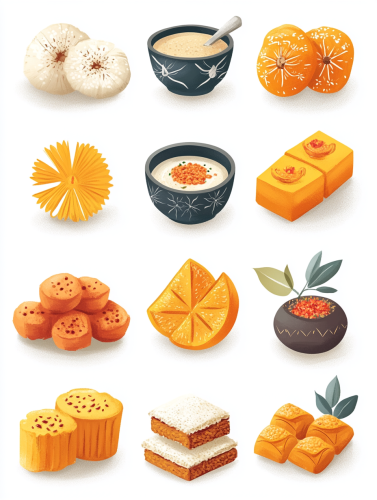 Traditional Diwali Foods and Sweets like halwa or gulab jamun, 2d stylish illustration, magazine publication style, in the style of bold shapes, flat colors, no shading, little detail, light cyan and dark amber, light pink, orange and dark gray, minimalistic illustrations, isolated on white background --ar 3:4 --stylize 250 --v 6.1