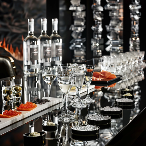 A sophisticated vodka-tasting setup in a stylish, modern lounge. The setting includes sleek, crystal-clear vodka glasses lined up on a reflective black table, with bottles of premium vodka and small, artfully arranged dishes of caviar, smoked salmon, and charcuterie. Subdued ambient lighting highlights the clean lines and premium quality of the glassware and bottles. Business professionals in elegant attire engage in conversation, swirling and inspecting their vodka. A background of upscale decor with metallic and dark wood accents adds to the exclusive vibe. photorealistic, Canon EOS 5D Mark IV DSLR, f/5.6 aperture, 1/125 second shutter speed, ISO 100 --v 6.0 --s 50