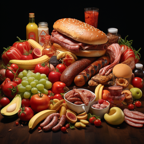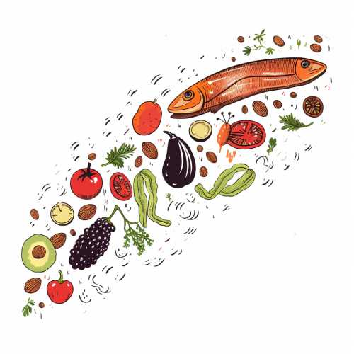 hand drawen linear illustration of foods falling from top to bottom: tomato, eggplant, mushrooms, chicken, basil, carrots, avocado, salmon fillet, nuts. One color: black lines on white background, vector, minimalistic