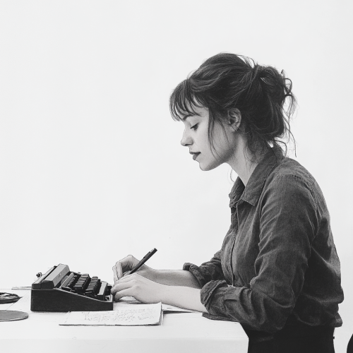 modern office girl sitting at desk writing on typewriter, sketch, white background studio, soft, black and white, front portrait headshot, front view, mid-shot, front