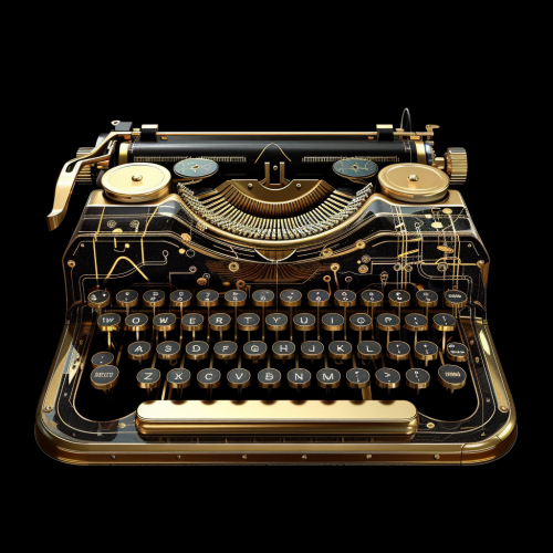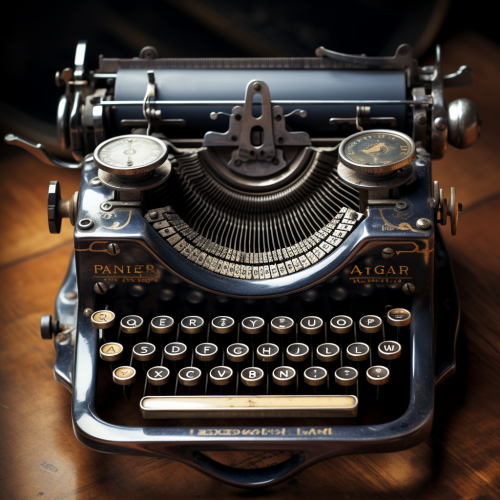 Digital old typewriter from 1900s in modern world, new form of writing in old style, old objects in new digitalized world, 3D form of self writing typewriter in blue color scheme with glowing glow and button structure, GPT chat controlling writing, on world scale --ar 16:9 --style raw --v 6.1 --stylize 1000