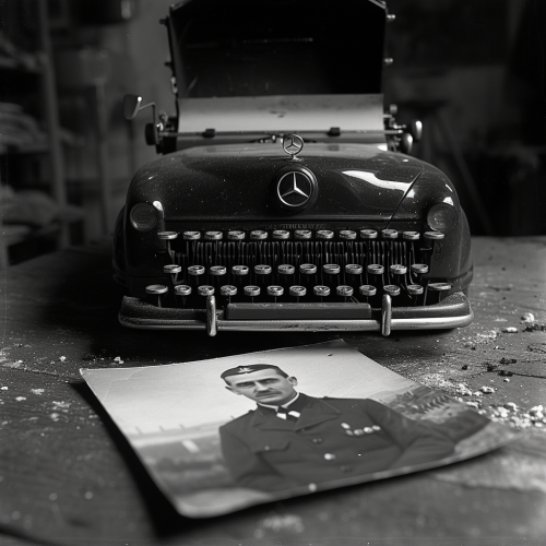 a 1970s messy journalist table seen from above coffee cup, ashtray, cigarette, cigarette pack, lighter typewriter notepad photographic camera --ar 2:1