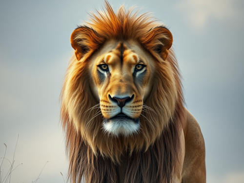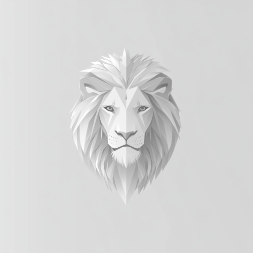 The logo consists of a geometric-style shape, a lion's head, a grey and white color scheme, a solid background, a vector design, minimalistic lines, and a 2D flat design in high definition.