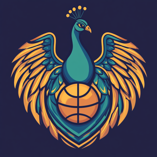 an basketball team logo.The peacock stands proudly in the center of the shield, wings spread protectively, symbolizing team spirit. A basketball is placed on the chest as an emblem of honor. Simple yet grand, emphasizing a strong, powerful image.