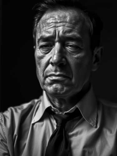 Dark illustration of a man screaming in agony. Full body side shot. Wearing leather gloves and a textile balaclava. His hands are touching his forehead.