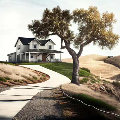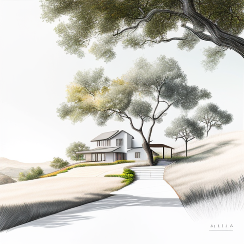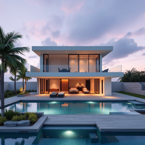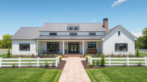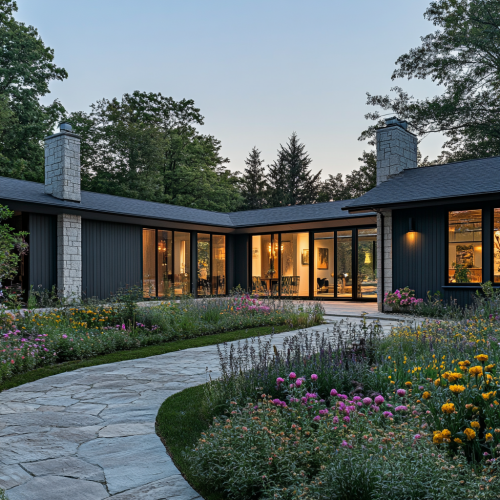 A single level, modern farmhouse with dark gray paneling, white stone accents, and large windows at dusk. There is an elegant pattern of flowers in the front yard, and on either side, there are tall trees. The house has multiple doors leading to different rooms. In front, it has a long stone walkway that leads up to two very wide glass doors, each leading into a separate room. there are no dormers on the roof