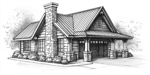 a black and white line drawing render of a firestation designed in the style of a modern farmhouse. The roof is a low slope standing seam metal and the siding is stone and board and batten. There should be wraparound porches and large overhangs. --ar 2:1