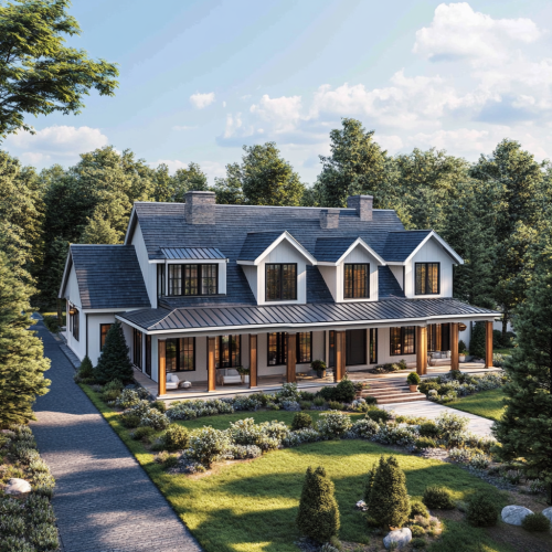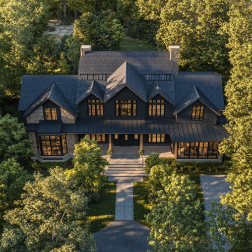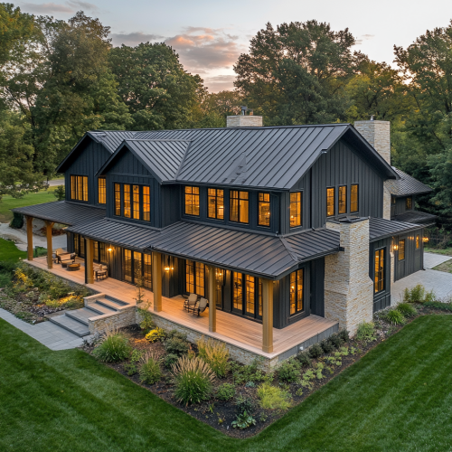 Wide aerial view of hyper realistic modern farmhouse with trees and heavy landscaping with both dark slate board-and-batten and light-colored board-and-batten and horizontal lap siding, a mix of dark shingle and metal roofing, black-framed double-hung windows, multi-gable roofline, front porch supported by wooden columns. Large front porch. Long driveway. 3car garage. lighting is cinematic