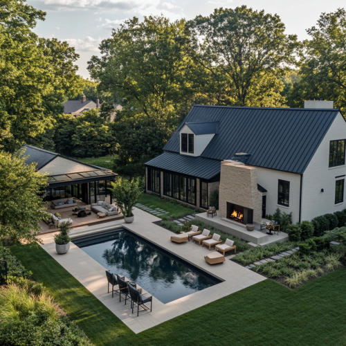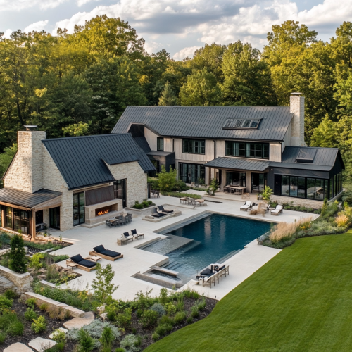 a wide aerial view of a large backyard with a small farm, large pool, fireplace w chairs on a patio that is behind a modern farmhouse with trees and heavy landscaping with both dark slate board-and-batten and light-colored board-and-batten and horizontal lap siding, a mix of dark shingle and metal roofing, black-framed double-hung windows, multi-gable roofline. lighting is cinematic
