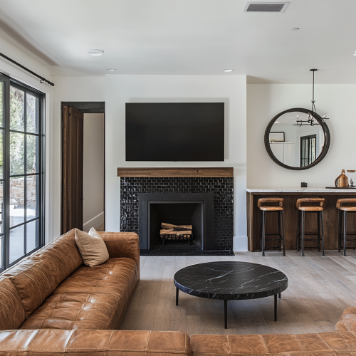 living room with floor to ceiling black tile fireplace with tv mounted, white walls, left wall with sliding door, right wall with built-in bar, saddle leather sectional sofa facing fireplace, black marble coffee table, round mirror above bar, laminate wood flooring, recessed lights, Spanish farmhouse modern theme, architectural digest, symmetrical, photographic composition, interior design inspo, traditional wall art, neutral tones, wide angle