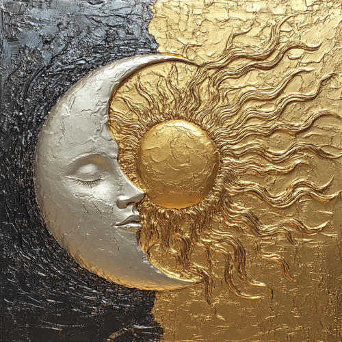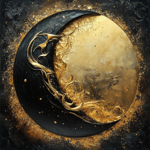 etailed eclipse artwork symbolizing the image that brings the sun and the moon together, gold and silver tones, dark tones, sun and moon, gold tones, flowing gold paint from the sun relief, gold relief background, full black moon and gold sun, gold circle inside of full moon black circle, flowing gold paint from gold circle, gold sparkles and stars around the circle
