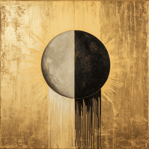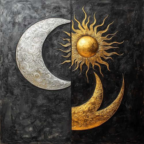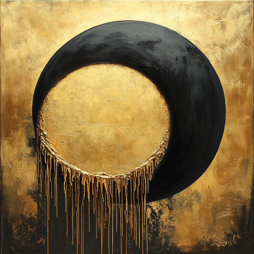 etailed eclipse artwork symbolizing the image that brings the sun and the moon together, gold and silver tones, dark tones, sun and moon, gold tones, flowing gold paint from the sun relief, gold relief background, full black moon and gold sun, gold circle inside of full moon black circle, flowing gold paint from gold circle, gold background