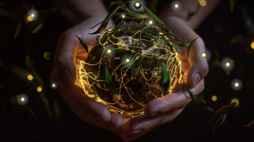 photograph of a pair of hands holding a miniaturized globe made of interwoven circuits and organic materials like vines or roots. Small, glowing icons representing AI and ethical considerations float around it. This image conveys a sense of stewardship over technology’s integration with the world, suggesting a thoughtful and balanced approach to automation’s future impact. 35mm, photorealistic, Canon EOS 5D Mark IV DSLR, f/5.6 aperture, 1/125 second shutter speed, ISO 100 --v 6.0 --s 50 --ar 16:9