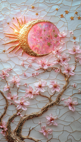 vaporwave sun and moon among white mother of pearl and bright shiny pink like a tropical beach and gold wavy pattern iridescent opal stained glass kintsugi with gold fillings and some stars, with tiny gold stars and pink cherry blossoms --ar 4:7 --stylize 250 --v 6.1